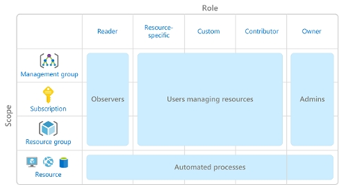 The following diagram shows the relationship between roles and scopes. A management group, subscription, or resource group might be given the role of owner, so they have increased control and authority. An observer, who isn't expected to make any updates, might be given a role of Reader for the same scope, enabling them to review or observe the management group, subscription, or resource group.