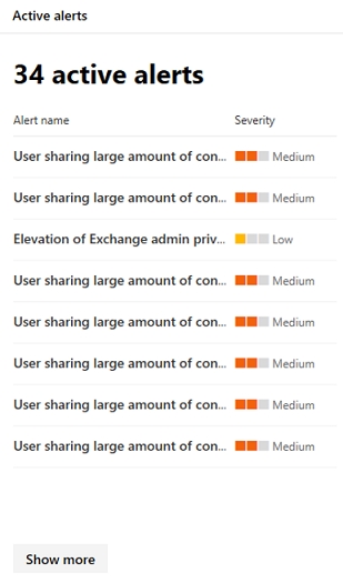 The Active alerts card includes a summary of the most active alerts and a link where admins can view more detailed information, such as alert severity, status, category, and more.