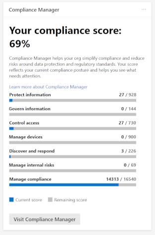 The Compliance Manager card. This card leads you to the Microsoft Purview Compliance Manager solution. Compliance Manager helps simplify the way you manage compliance. It calculates a risk-based compliance score that measures progress toward completing recommended actions to reduce risks associated with data protection and regulatory standards. The Compliance Manager solution also provides workflow capabilities and built-in control mapping to help you efficiently carry out improvement actions.