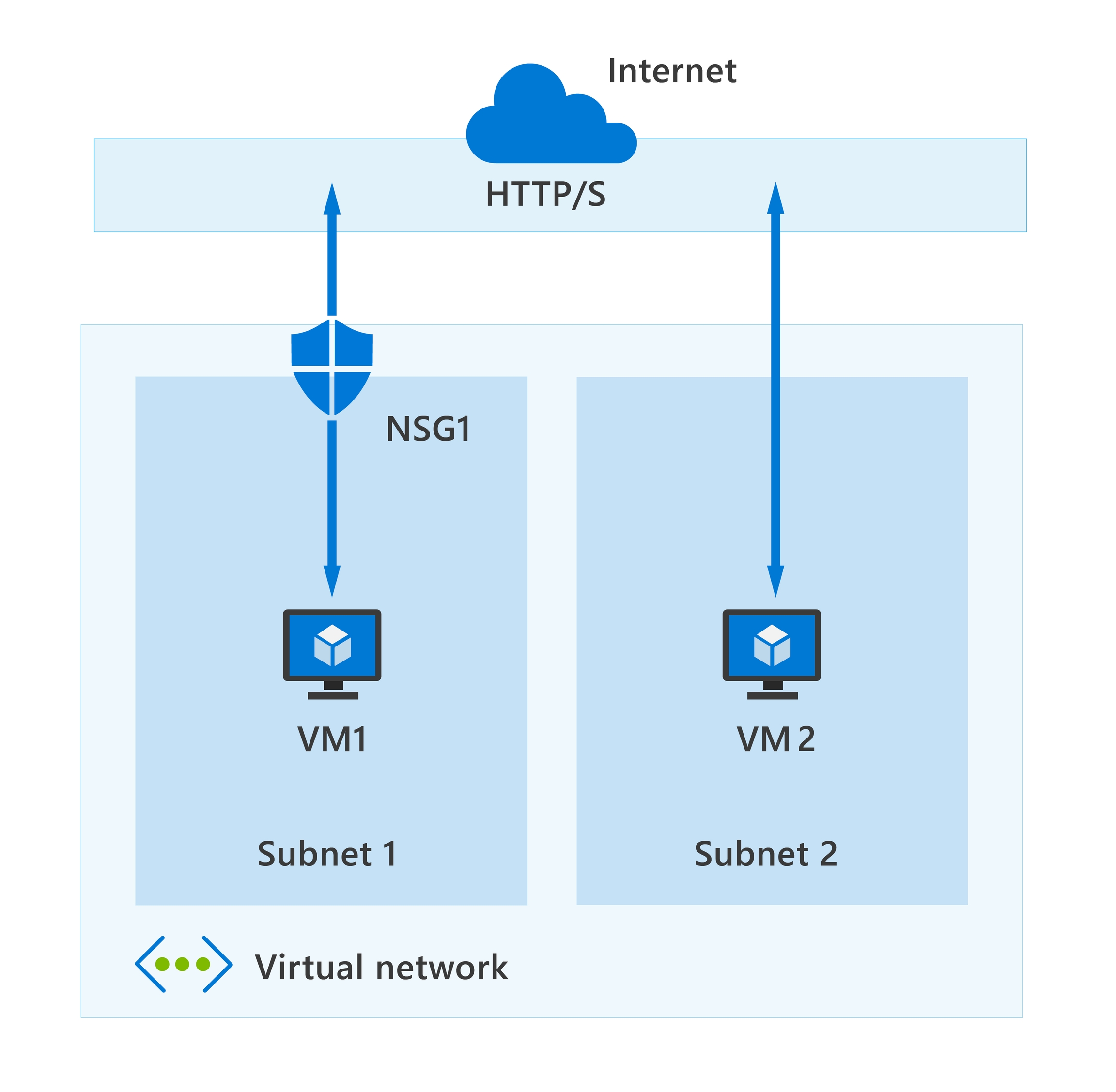 In the highly simplified diagram, shown below, you can see an Azure virtual network with two subnets that are connected to the internet, and each subnet has a virtual machine. Subnet 1 has an NSG assigned to it that's filtering inbound and outbound access to VM1, which needs a higher level of access. In contrast, VM2 could represent a public-facing machine that doesn't require an NSG.
