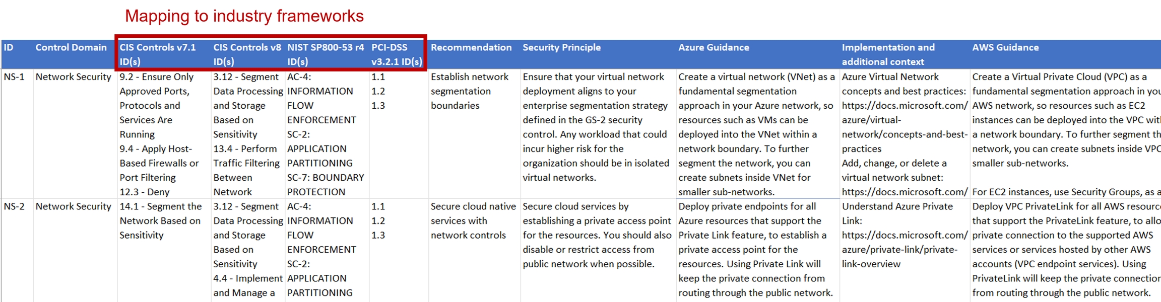 Azure Guidance - Azure Guidance is focused on the "how", elaborating on the relevant technical features and ways to implement the controls in Azure. Continuing with the example of NS-1, the Azure guidance includes information regarding creating a virtual network (VNet), using network security groups (NSG), and using an application security group (ASG).