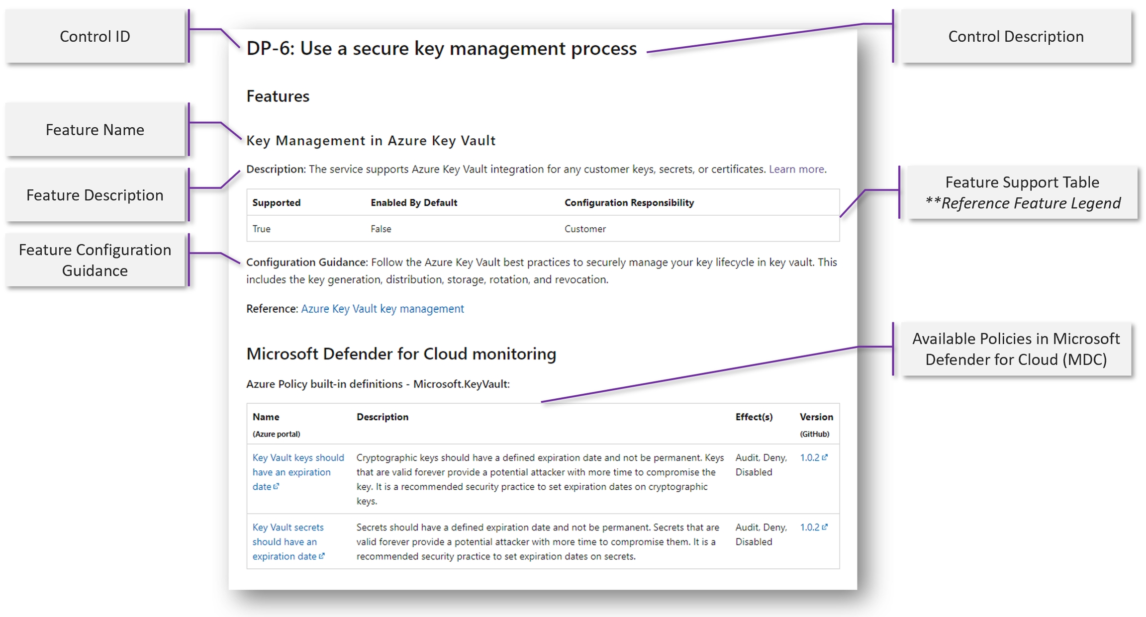 The image below, which is an excerpt from the Azure Key Vault security baseline, highlights the type of information provided in a security baseline.