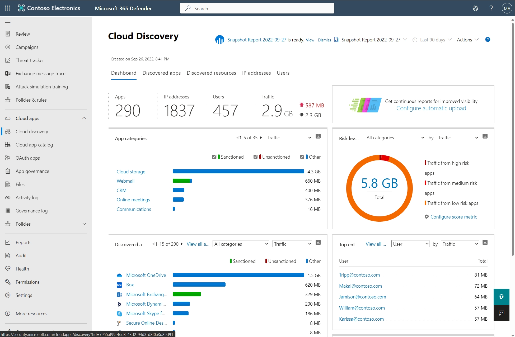 Protect against cyberthreats and anomalies: Detect unusual behavior across cloud apps to identify ransomware, compromised users, or rogue applications, analyze high-risk usage, and remediate automatically to limit risks.