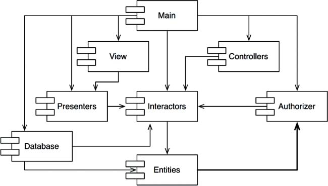 For example, in the following graph, we can easily go from the Authorizer component, through Interactors, to Entities and then back to it.
