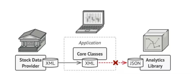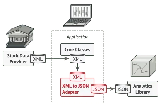 We can solve this problem by creating Adapters to convert XML to JSON format for each class of the analytics library. Then we adapt our code to only communicate with the library through these Adapters. When an Adapter receives a request, it translates the XML data to JSON and passes the request to the appropriate methods of the parsing object in the library.Adapters can not only convert data into many different formats but can also help objects with different interfaces collaborate with each other.