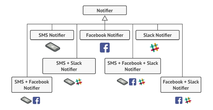 You tried to solve that problem by creating special subclasses that combine multiple notification methods in one class. However, it quickly becomes clear that this approach will make your source code unnecessarily large and complex, not only for the library but also for the user.