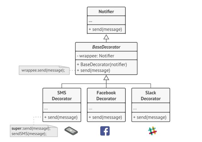 The client code will need to contain a basic notification object as a set of user-dependent decorators. Decorator objects will be structured as a stack.