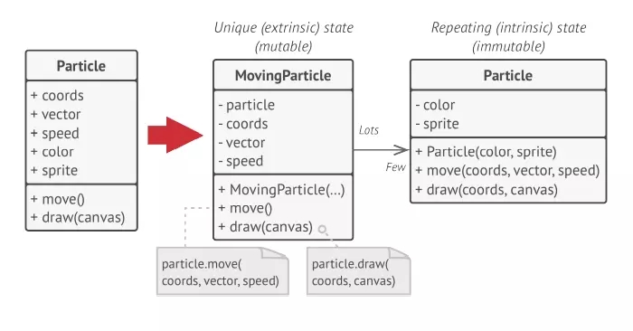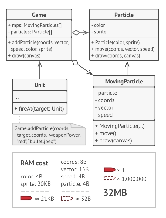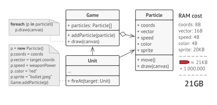 It's easy to guess, the reason is because each Particle class contains too much information: position, coordinates, vector, speed, color, sprite. Meanwhile, there are types of information that always change with each unit and types of information that are often the same between types of units. If one does not know about the flyweight pattern, one will have to give up and plan to raise the system requirements of the application - which is an unwise move.