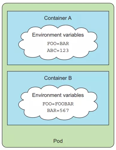 The configuration of the application in a container is often communicated through environment variables (abbreviated env).