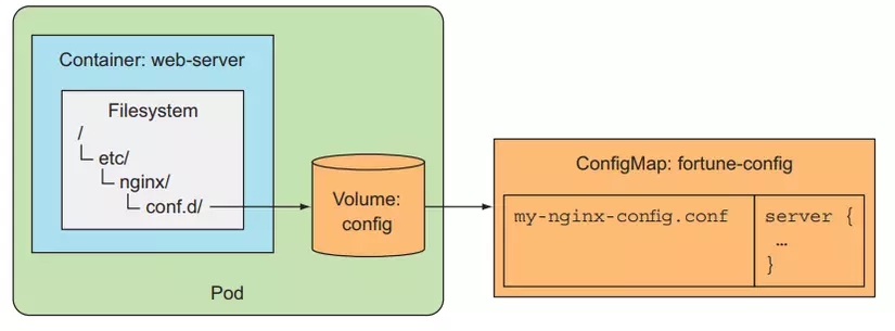 Here, our ConfigMap will be used as a volume, with content being the content in the ConfigMap. At this time, our volume will contain a file named my-nginx-config.conf, then this file will be mounted to the web-server container in the /etc/nginx/conf.d folder, we will have /etc/nginx/ conf.d/my-nginx-config.conf