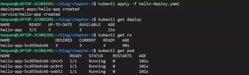 Now let's create a Deployment. Deployment's config file is mostly the same as ReplicaSet's, just change kind to Deployment. Create a file named hello-deploy.yaml: