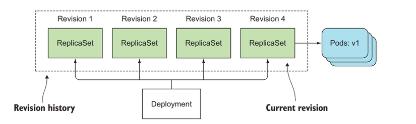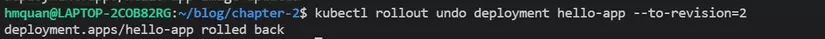 Yepp, our application has printed Hello application v2 , so we have successfully rolled back to the previous version. Now we just need to fix the bug and deploy the new bug-free version. Everything becomes easier, no need to revert the code on git or anything, there is still time to fix bugs without affecting the client. As you can see, this is the strong point of using Deployment to run our application. This is an illustration of revision history.