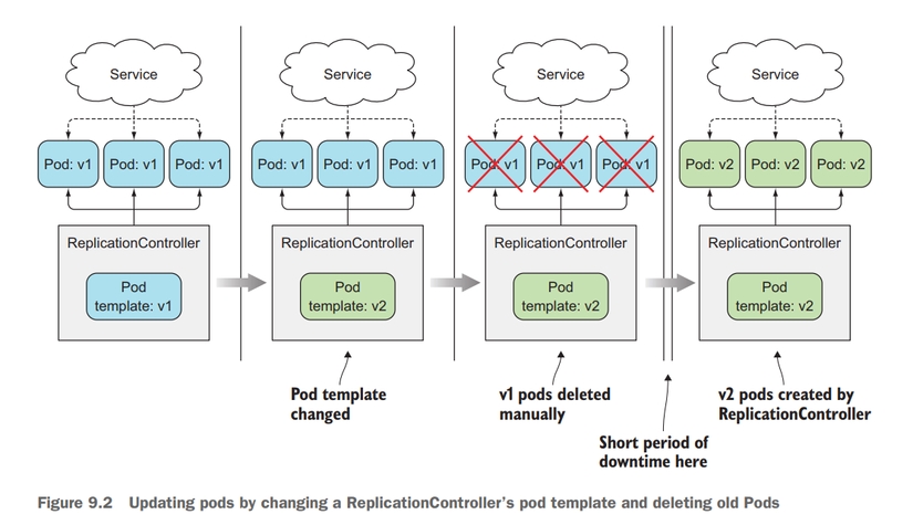 In this way of deploying, we will first delete the entire old version of the application, then we will deploy a new version. For kubernes, first we will update ReplicaSet's Pod template, then we delete all current Pods, so that ReplicaSet creates a Pod with a new image.