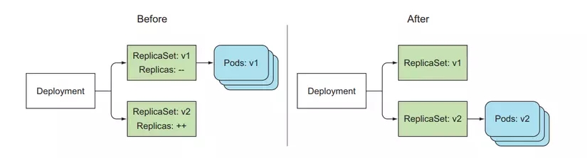 In this way, we will deploy each new version of the application, make sure it is running, we route the request to the new version of this application, repeat this process until the entire new version of the application is deployed. and the old version has been deleted. For kubernetes, we will delete each Pod in turn and ReplicaSet will create a new Pod for us.