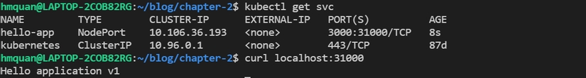 If Hello application v2 is printed here, then our application has been updated to the new version. As you can see, the process of deploying a version of the application is extremely simple if we use Deployment. We can also choose the deployment strategy we want extremely simply by specifying in the Deployment's strategy attribute .