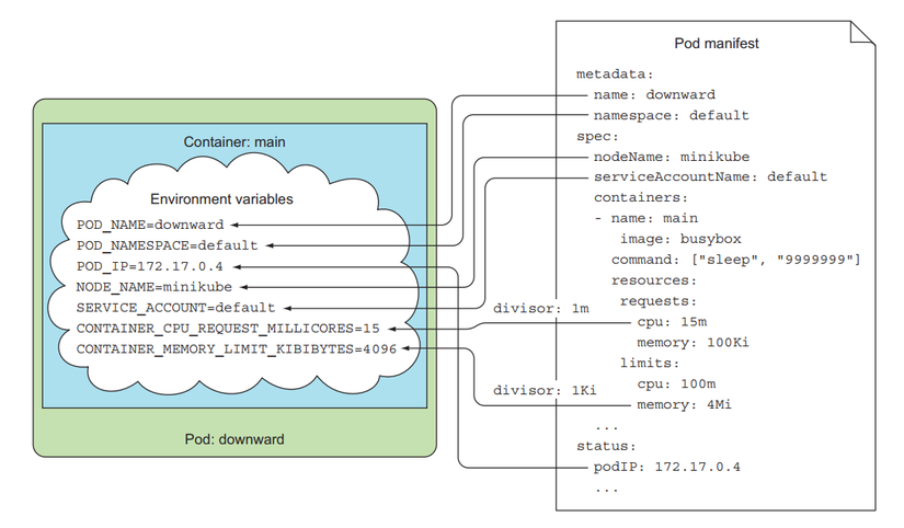 We will use the fieldRef and resourceFieldRef properties in the Pod's env config to pass metadata to the container through the Downward API. With fieldRef we will specify the fieldPath attribute for it, and access the name of the Pod used metadata.name, the name of the worker node used spec.nodeName.
