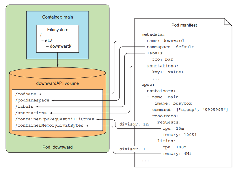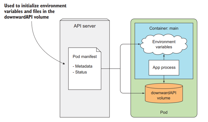 The Downward API allows us to pass the Pod's metadata and its environmental information inside the container. We can use this information and pass it through the Pod's env config, or the Pod's volume config to pass to the container as a file. And don't let the name of the Downward API confuse you, it's not a REST endpoint, it's just a way for us to pass the Pod's meta information into the container.
