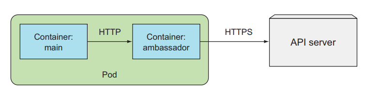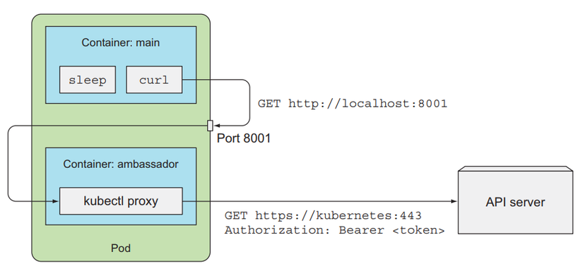 Instead of having to do a lot of things like using ca.crt and using token files, we can use a pattern called ambassador. This pattern will deploy an additional container in the same Pod as the main container. This sub-container will be called Sidecar Container, which will support functionality for the main container. Here, this sidecar container will be in charge of authentication to the API server. The main container just needs to call the sidecar container and it will send the main container's request to the API server.