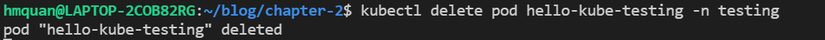 So we have successfully created the pod in namespace testing. Let's delete the pod. When deleting, we also need to specify the namespace containing our resource.