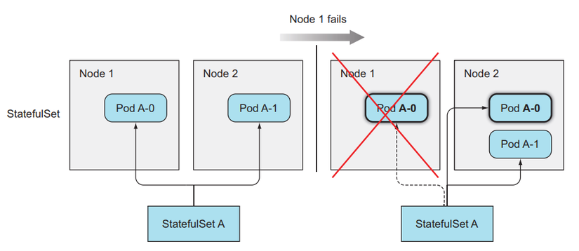 Unlike ReplicaSet, StatefulSet will ensure that Pods with the same identifier are never created, so when a node fails. StatefulSet will not create a new Pod before making sure the old one is gone.