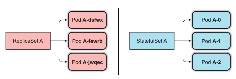 Each Pod created by StatefulSet will be assigned an index, which will be used to identify each Pod. And the name of the Pod will be set in style <statefulset name>-<index>, not random like ReplicaSet.