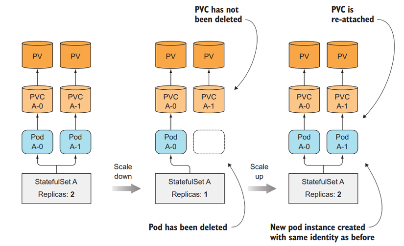 When we scale up a Pod in StatefulSets, there will be a new Pod and a new PersistentVolumeClaims created, but when we scale down, only the Pod is deleted, the PersistentVolumeClaims is still there and not deleted. So that when we scale up again, the Pod will still be properly attached to the previous PersistentVolumeClaims so its data will remain the same.