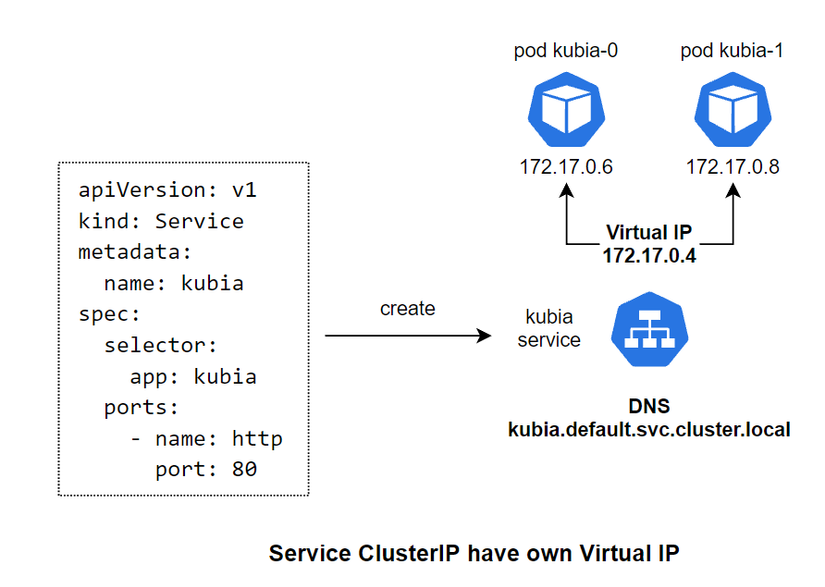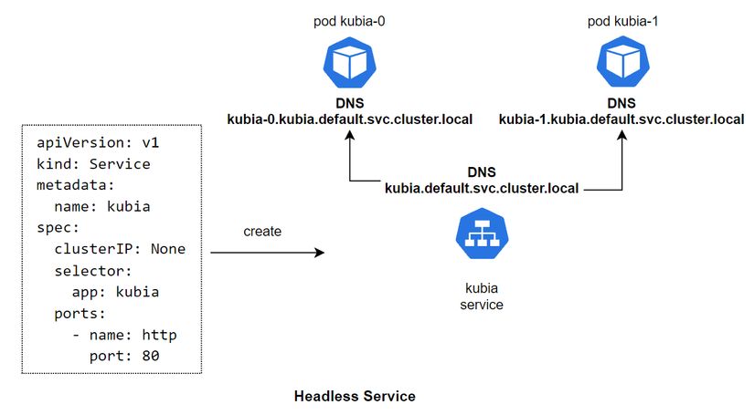 As for the Headless Service, when declaring the config we will specify the clusterIP: None attribute for it. When we create a Headless Service, it will not create a Virtual IP for itself, but only create a DNS. Then, it will create DNS for each Pod behind it, and map the DNS to the DNS lines of the Pod behind it. For example, kubia-0 will have the corresponding DNS as kubia-0.kubia.default.svc.cluster.local .