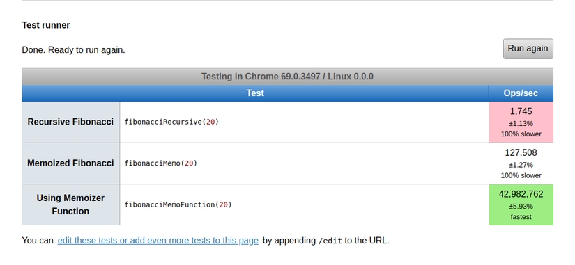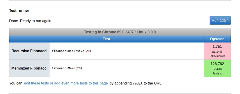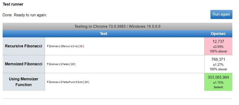 We can see it is very impressive, when pure recursive code only operates at a speed of 1,751 ops/sec, 99% slower than using memoization with 126,762 ops/sec.