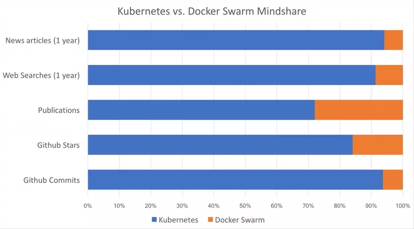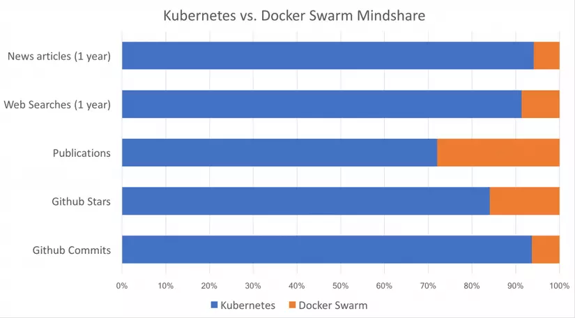 This comparison is synonymous with the Kubernetes vs. Docker Swarm - Docker's own container orchestration technology. The basic difference is that Docker only manages a single node (many containers in 1 node) while Kubernetes manages a cluster of nodes. => Kubernetes has the ability to deploy more widely, serving real-world products more effectively. It has been shown that Kubernetes leads every metric when compared to Docker Swarm: