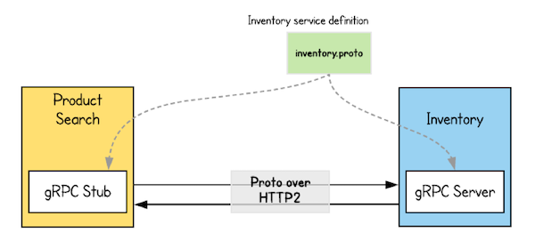 On the client side, the client has a local object known as stub (for some languages, the preferred term is client) that implements the same methods as the service. The client can then just call those methods on the local object, and the methods wrap the parameters for the call in the appropriate protocol buffer message type, send the requests to the server, and return the server’s protocol buffer responses.