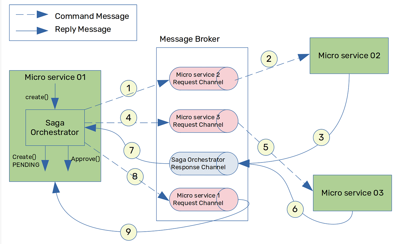 In Figure 05, when microservice 01 receives the create() request, it creates the saga orchestrator. This will set the service request to the PENDING state until the saga orchestrator gets the complete approval. Meantime, the saga orchestrator sends request commands to both microservice 2 and 3 and gets the responses back via the saga orchestrator response channel in the message broker. Based on the outcome of both responses, the orchestrator will approve or reject the request.