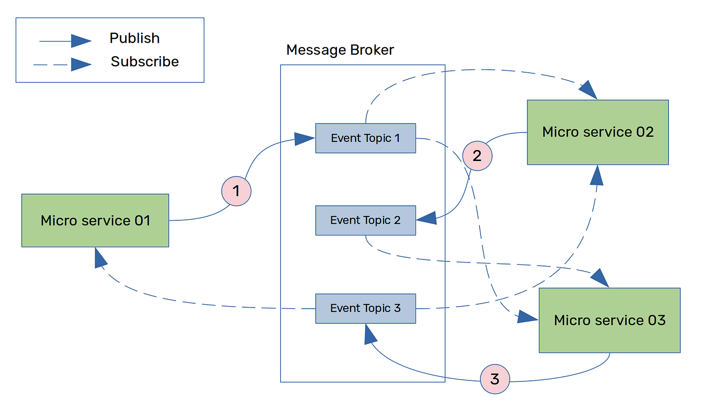 Each saga participant updates its local database and publishes an event that triggers the next participant. For example, in Figure 04, once microsrevice 01 completes its local database update, it publishes an event to Event Topic 1 in the message broker. Saga participants, which are subscribed to Event Topic 1 are now triggered to execute any other actions within the microservice and publish further events (if any) to connect with other saga participants. Likewise, the flow can continue until the saga is fully completed.