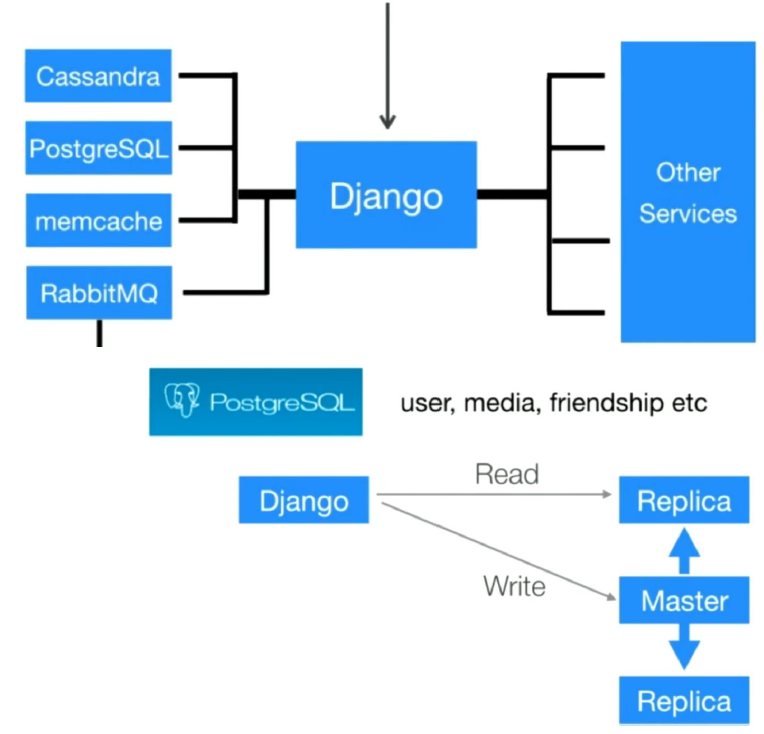 This is so popular on microservices architecture also let me give an example of Instagram architecture. Instagram basically uses two database systems, one is relational database PostgreSQL and the other is no-sql database — Cassandra.