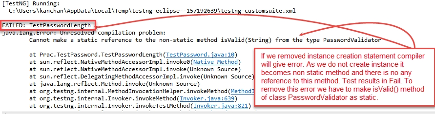 Scenario 3: After refactoring the output shows failed status (see image below) this is because we have removed the instance. So there is no reference to non –static method isValid ().