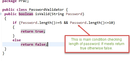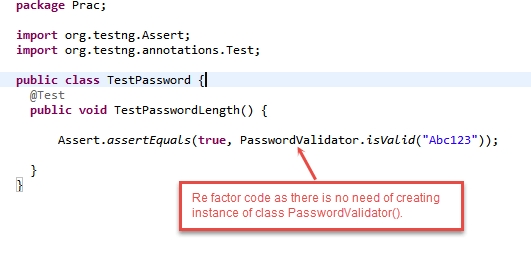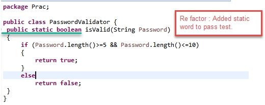So we need to change this method by adding “static” word before Boolean as public static boolean isValid (String password). Refactoring Class PasswordValidator () to remove above error to pass the test.