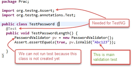 Here in this Test Driven Development example, we will define a class password. For this class, we will try to satisfy following conditions.